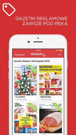 Okazjum.pl to aplikacja największego w Polsce serwisu z gazetkami promocyjnymi sieci handlowych. Dzięki niej można porównywać ceny i rozsądnie planować zakupy.
