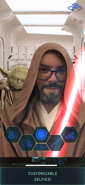 ● Take and share a Star Wars “selfie” in various iconic costumes and settings, including Jedi, Princess Leia (with hair buns), Han Solo’s carbon freeze, and more