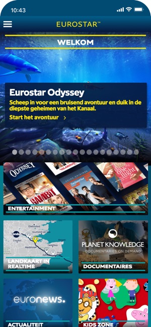 De gratis wifi in de trein biedt een ruim assortiment programma's en films. Er is voor iedereen wat, zodat het hele gezin mee kan genieten. We werken ook samen met Amazon voor de spannendste televisiereeksen, allemaal via onze app. Met Eurostar Odyssey hebben we zelfs een virtual reality-avontuur diep in de zee. Zeemeerminnen!