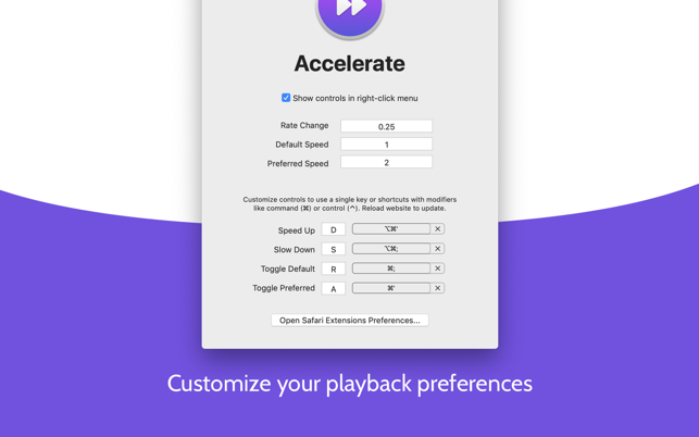 Accelerate for Safari is a powerful, fully customizable extension for controlling video playback speed in Safari. Use personalized keyboard shortcuts or right-click on any webpage to easily change the playback rate for any video on the web.