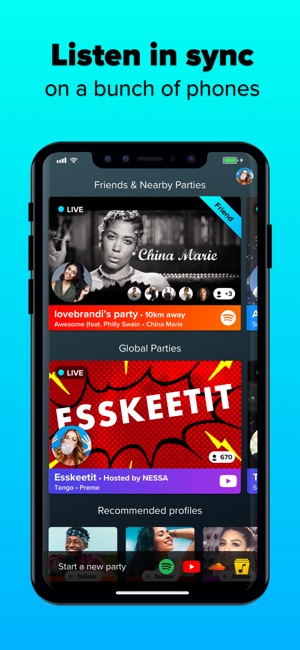 2 - Start your own party via Youtube, Spotify, SoundCloud, or your music library or join a party nearby or Live Party if you don’t feel like being the host.