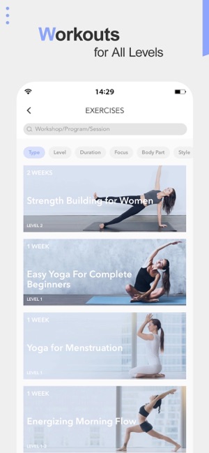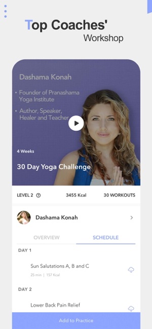 • 50+ Scheduled plans focused on beginners, weight control, body sculptor, glowing skin, strength & flexibility, inner shine, etc.