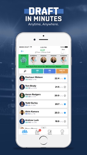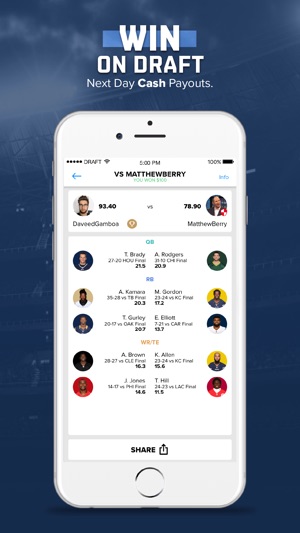 Compete in live Snake Drafts for real money against other people. Each contest takes just minutes to complete. Win cash every day on the highest-rated daily fantasy sports app.