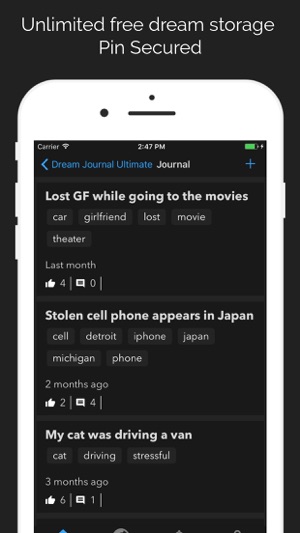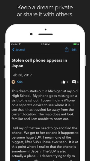 For any dream you enter, you can keep it private or share it to the Dream Wall, a dream based social network where you can share your dreams with other users to get feedback. Share as many or as little as you want.