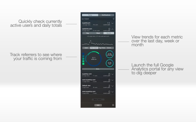 GA.TODAY is the fastest and easiest way to view your Google Analytics metrics. It's also the first App to provide access to your realtime, daily, weekly and monthly Analytics metrics in a today widget, just like it should be.
