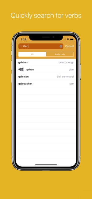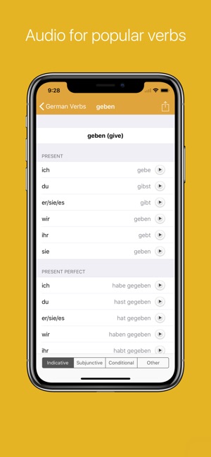 Now with audio!! Not sure how to pronounce a verb? Listen to the 50 most commonly used German verbs, as spoken by a native German speaker. Just tap on the button next to the conjugation.