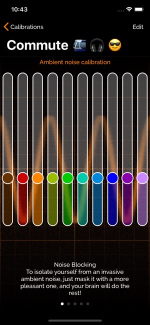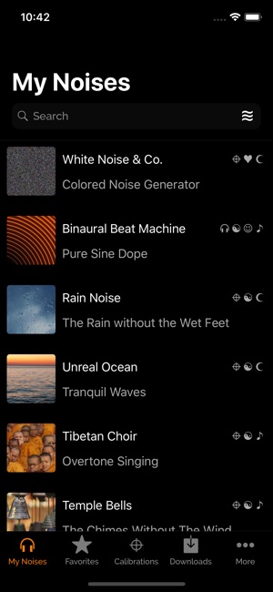Some of our noises are truly special: our so-called calibrated noise generators cover the entire audible frequency range, from 20 Hz to 20 kHz, over 10 color-coded octaves. Thanks to our unique calibration procedure, each calibrated generator can be made spectrally flat to your ears. As we get older, we all suffer from age-related hearing loss involving the higher tones. During the calibration procedure, we are able to measure your personal hearing levels, and adapt our calibrated noises - such as the rain noise - accordingly. You'll be surprised to hear frequencies you thought were lost forever!