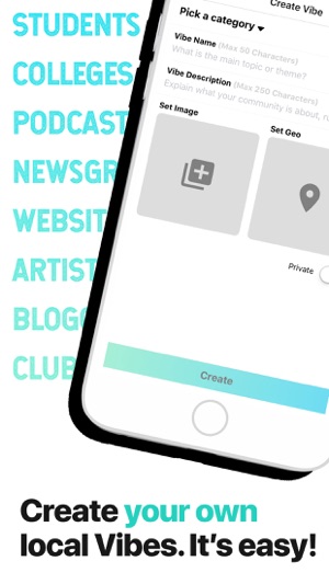 As a Vibe Creator, use our advanced "Around You" location-based Manager tools to help drive local people to your content. Set your communities geo radius pin on the map to show up on local users Around You page for instant discovery. Next, add your Vibes to content-specific groups like On Campus, Podcasts, Blogs, Private Content, or Visual Storytellers, etc.