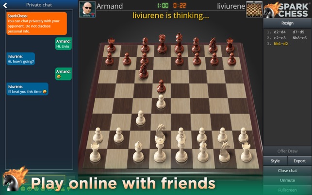Complete with online play and a child-safe chat system, you can also import and export of your SparkChess game using the standardized FEN system that allows you to recreate any board configuration to continue your game elsewhere; even using a physical chess set!