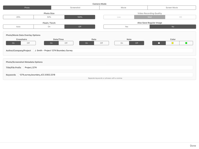 Theodolite lets you take data-overlay camera images and movies, with 2X-8X digital zoom and fast image processing. You can overlay geographical data, date, time, author/company info, and project notes directly on photos and movies for later reference. The same data is written into the metadata record of images, making the image files self-contained image+data records. Third-party apps can tap into Theodolite's advanced camera functions with a new camera sharing feature.