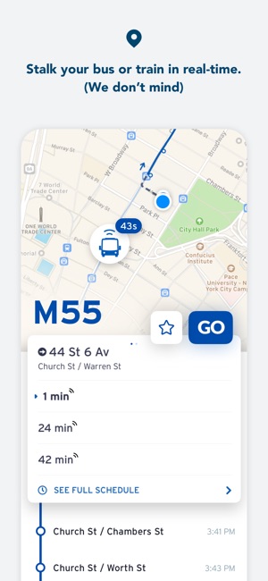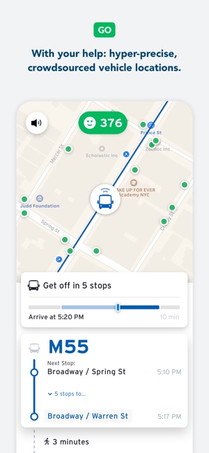 Whenever you use “GO”, you’ll be broadcasting super-precise vehicle locations all the way down your line. With GO enabled, you help generate better, faster, more accurate ETAs than the MTA’s own system. Because your transit data should be updated in New York minutes—not New Orleans ones. (Still love you NOLA.)