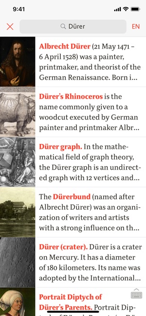 SEARCH RESULTS: Powered by both Wikipedia’s full-text and prefix search, you’ll find what you’re looking for. Matches are displayed as rich article previews, tweaked for both legibility and high information density.