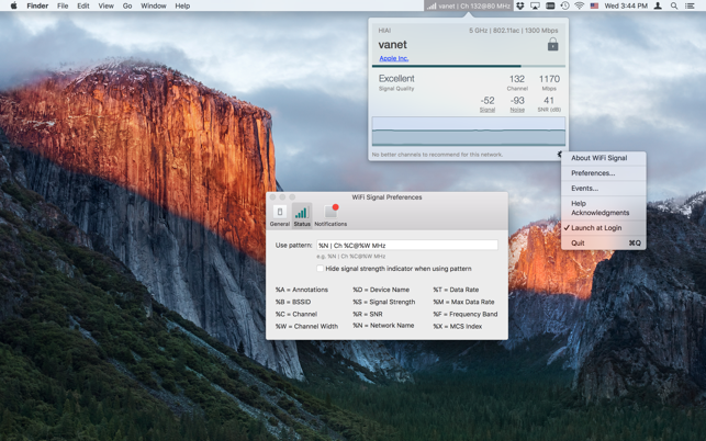 WiFi Signal is a system menu bar application that provides easy access to your Wi-Fi connection details (name, channel, transmit rate, signal strength, noise, etc.), monitors the signal quality of your wireless network, and can find and recommend alternative channels for your network thus avoiding signal overlapping and channel conflicts that can result in connectivity issues and performance degradation.