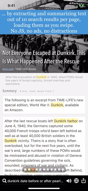 2. Reader mode (clean text, like Safari's) with summary of each article, perfectly formatted for mobile screens. So you can browse & find answers in shortened summaries faster still, beyond the 10-100x loading speed up