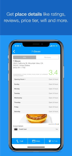 ◆ Get useful info such as: WiFi availability, accepts credit cards, takes reservations, has outdoor seating.